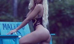 The hot brunette wears a revealing top, emphasizing her eye-catching big tits and a tiny sexy shorts, leaving uncovered awesome curvy hips and legs.