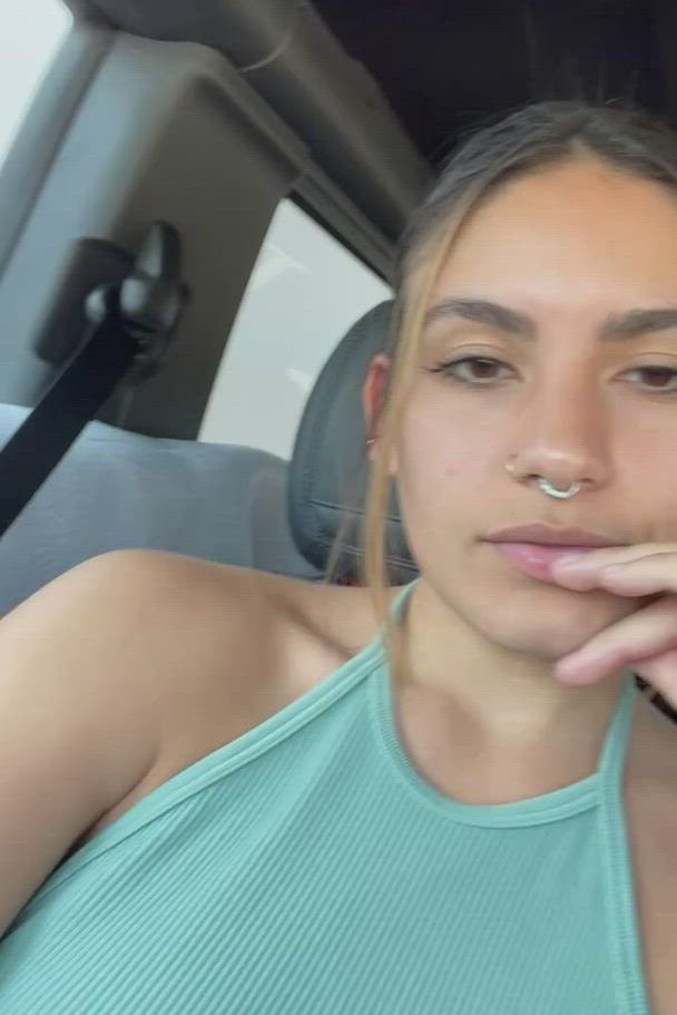 A public nudity video with a cute girlfriend flashing her sexy pierced tits under the braless t-shirt, inside the car!