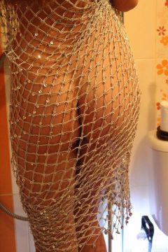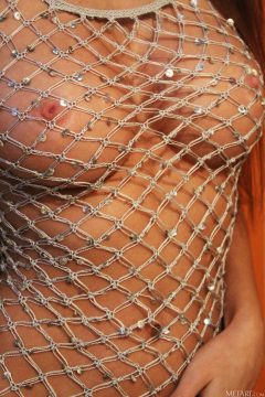 Sensual erotic girl Holly Haim wears a mesh dress into the shower that stretches tight over her voluptuous curves!