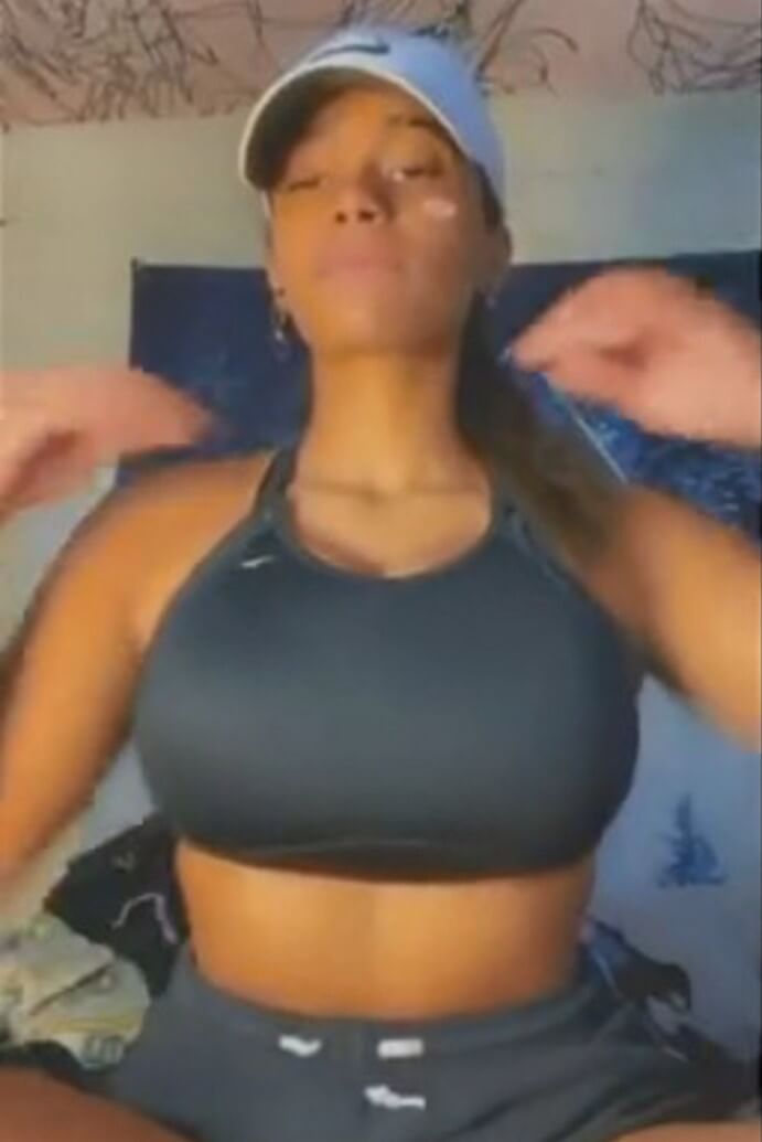 Watch the athletic black woman exposing massive boobs under sports bra and bouncing them.