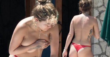 Nude celebrity pics of the hot singer having a wardrobe malfunction exposing her tit, as she’s relaxing poolside wearing a green Bikini.