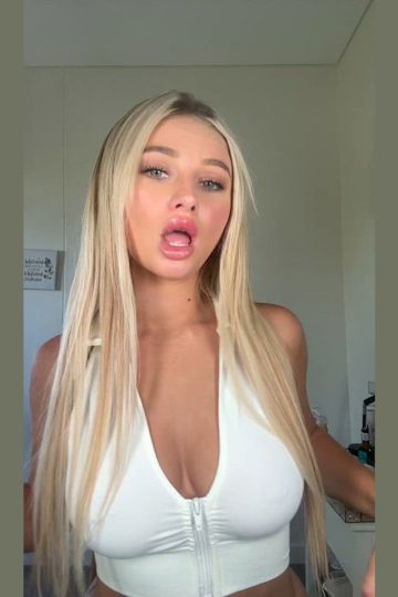 Platinum-blonde haired fit babe exposes her big tits with puffy nipples from braless crop-top and shows up her hot curvy ass in see-through thong panties.