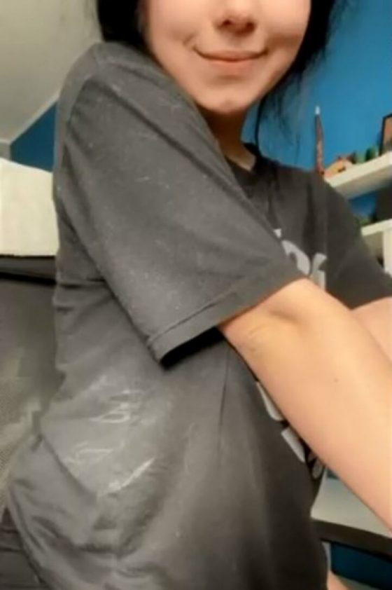 Watch the young girl revealing and shaking her big boobs under her blouse.