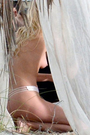 The famous fashion model was caught topless by paparazzi, wearing a thong bikini on her vacations.