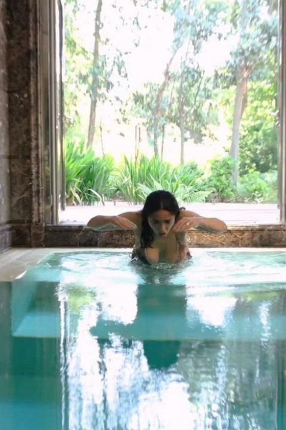 Video celeb gif of the famous Hollywood busty actress Salma Hayek wearing a sexy bikini dips into the water in an idoors swimming pool. Outstanding …
