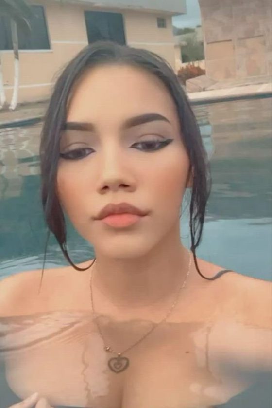 Watch the topless Asian playmate making her wet nipples harder in the swimming pool on Reddit.
